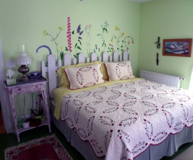 Get your day started with the glow of the morning sun and the rosy bath. This room seems to be alive even on a gray and rainy day. Gardens and flowers bring such peace and restoration to the soul . . . bring us a clipping of your favorite plant and add it to our collection or take a snip of ours home with you. The small fountain may remind you of a babbling brook . . . imagine.