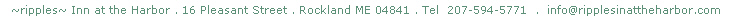 | ~ripples~ Inn at the Harbor is an Authentic Maine New Englander Bed & Breakfast offering casual comfort just steps from the Rockland Harbor on Penobscot Bay. No pretenses here. Grandma's been updated ! Simplicity; Always in Season! Simply MAINE. |