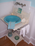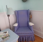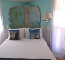 Cool and crisp (but no sand on the floor) this sweet room is similar to the small cottages found all over the neighborhood of South Rockland (SoRo). With classic wainscoting and carved sea birds, the deep blue water and waves of Rockland Harbor are just a few steps away. This is the only guest room on the first floor. Private bath of course, with tiled shower and a unique antique wash stand. Listen for sounds of the creaking masts and halyards on the sailboats bobbing in the bay… or the seagulls welcoming the ferry coming into dock. Breathe in the salt air and dream. A queen size bed welcomes the weary beachcombers. |